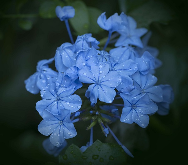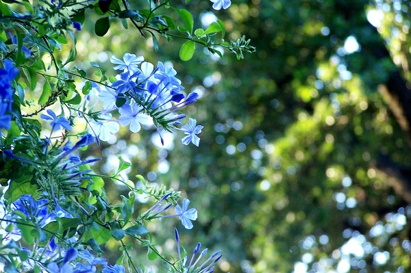 Plumbago cveta od ranog proleća do kasne jeseni. Cvetanje zaustavlja samo u periodu hladnih zimskih meseci. Cvetovi se formiraju na bočnim izbojcima i sakupljeni su u grozdaste cvasti romantično plave boje. Inače, cvetovi nemaju neki poseban miris.